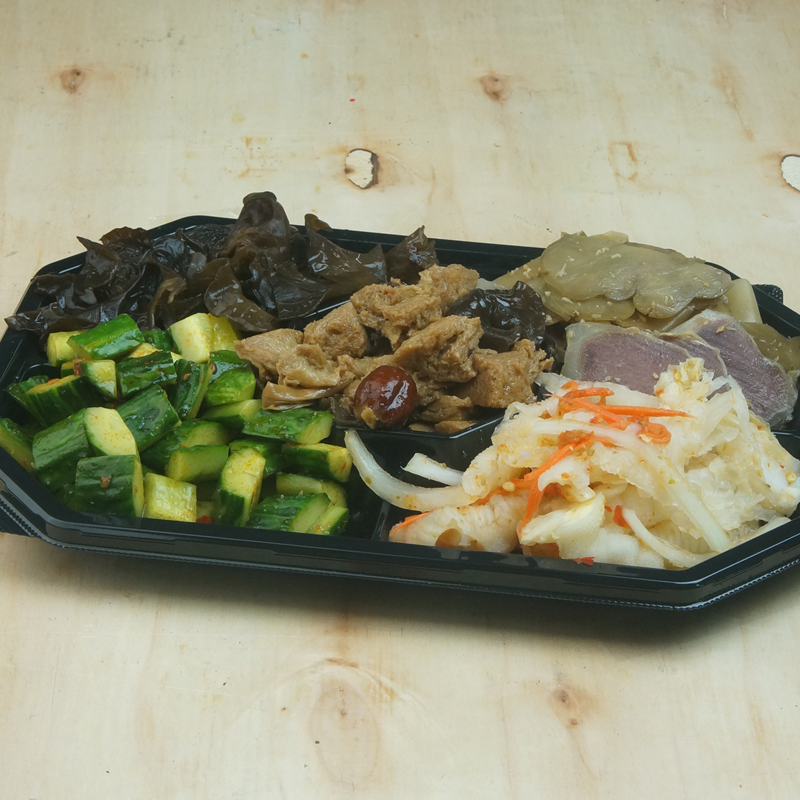 拍青瓜、涼拌雲耳、炸菜腎片、四喜烤麩、酸辣鳳瓜