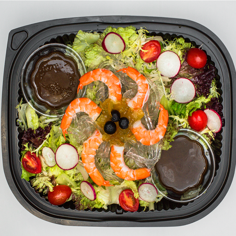 大蝦、寒天藻絲、柚子醬、車厘茄、櫻桃蘿蔔片、藍莓、雜菜沙律