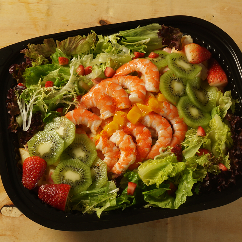 蟹籽、大蝦、芒果、奇異果、士多啤梨、蜜桃、雜菜、碎蛋提子蘋果哈密瓜沙律
