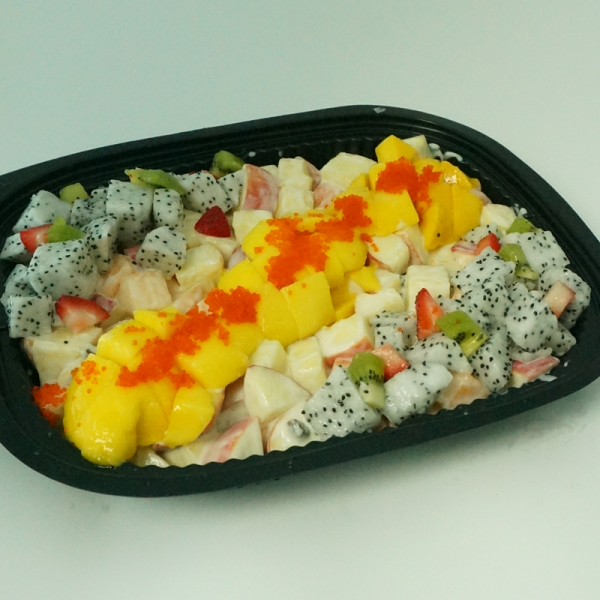 芒果、奇異果、火龍果、士多啤梨、蟹籽、碎蛋提子蘋果哈密瓜沙律